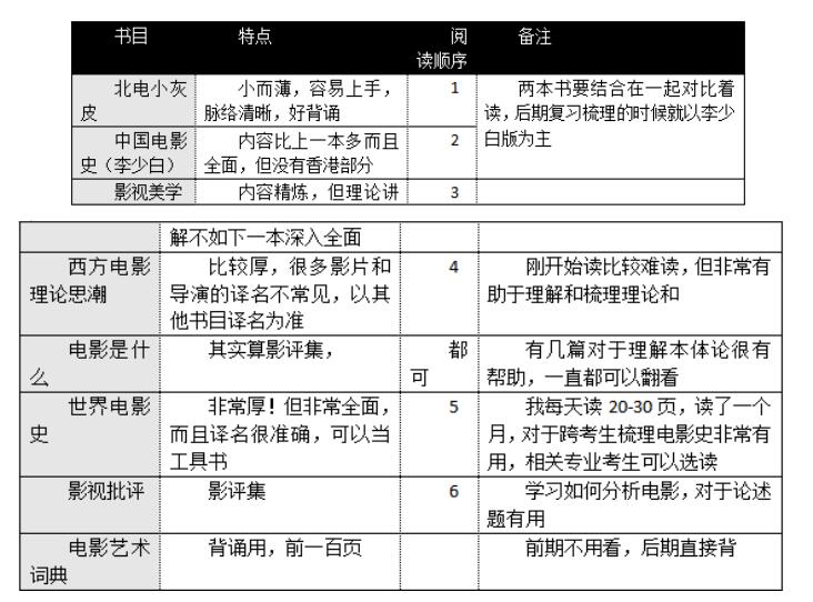 除世界电影史和艺术词典外的书目都要看两遍,3月到6月除了上课我就一直在看书和看片。背书我是从8月左右开始背的,现在看来是有点晚了,可以从7月一开始就背专业课。