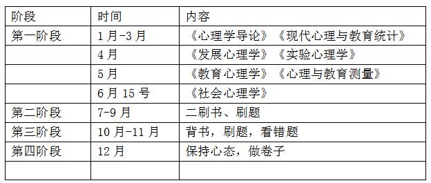 专业课:专业课一共是七本书。分别是《心理学导论》黄希庭第二版、《现在教育与心理统计》张厚粲第五版、《心理与教育测量》戴海琦第三版本、《教育心理学》、《发展心理学》、《实验心理学》朱莹、《社会心理学》金盛华。专业课的备考,可以先把书买回来看。因为参考书比较多,所以得花很多时间刷一遍。所以建议早一点备考。我给大家推荐一个专业课的复习计划: