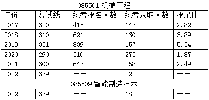 注:085509智能制造技术是2022考研新开的专业,本质上是从085501机械工程里分出来的,因为两者考核内容完全相同,复试线也是统一划线。两者的初试科目均为数二、英一、823机械制造技术基础。