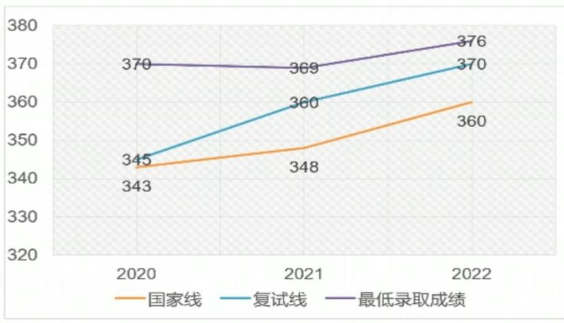 最后给出成电近三年来的分数趋势折线图:可见近三年的分数一直呈现上涨趋势,可能是随着考研人数的日益增多以及成电的应用经济学专业日益被考生所知晓和认可。