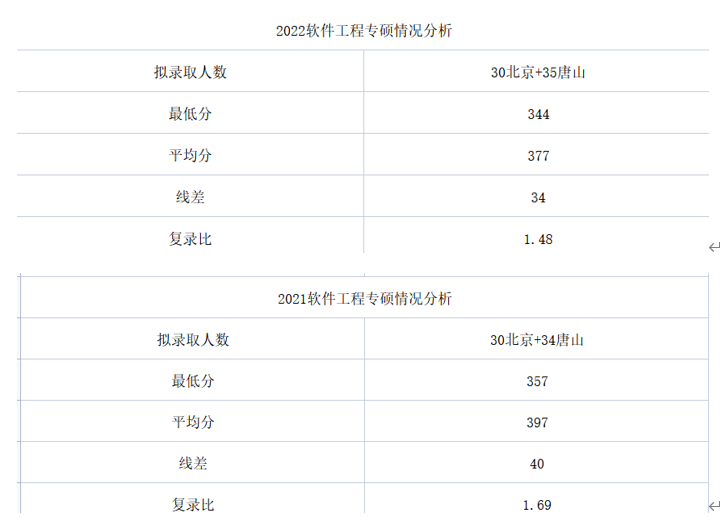 上图软件工程拟录取名单数据分析,复录比为1.48,相对于21年的复录比有所降低。2022年进入复试的最高分416,最低分343,平均分371,相对于21年有所降低,并且2022年的拟录取人数相对于21年,增加了1个唐山名额,从分数下差额可以看出,基本上要超复试线40分,是比较稳的,其他同学在复试的过程中要继续努力。