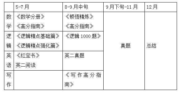 英语此阶段可以开始做英语二真题,同时伴随记单词。做真题可以分板块做,先做阅读在做完形、翻译和写作。每做完一篇阅读,对每篇阅读进行精读,主要可以通过翻译去精读。同时,做错的题目要自己思考错,总结成文避免下次出错。还需要细致的分析每个题目,从出题人的角度思考每个题的意图以如何去排除干扰选项。