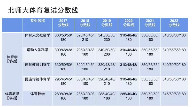 上图为北师大近几年的复试分数线,由于北师大是34所自划线院校之一,故各科均不同于国家线,基本都是高于国家线,根据上图,可知近几年来北师大体育专业的分数线呈上升趋势,这主要是因为学生的水平越来越高,复习的战线越来越长,报考的人数越来越多,故而竞争越来越大,但是23年的分数线再高也不会超过21年的分数线。