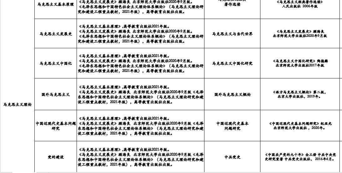 华师马理论除思政方向之外,其余方向初试科目和参考书均一致:《马克思主义基本原理》,高等教育出版社2021年版;《马克思主义发展史》顾海良北京师范大学出版社2020年9月版;《毛泽东思想和中国特色社会主义理论体系概论》(马克思主义理论研究和建设工程重点教材,2021年版),高等教育出版社出版。