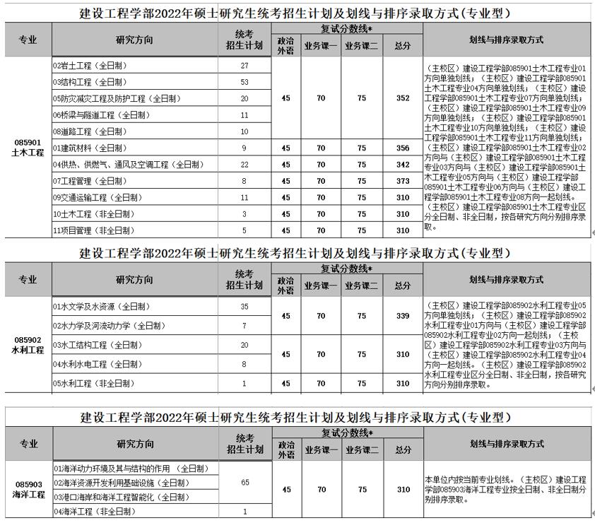 在2022招生计划中,土木水利085900(一级学科)已经分成了三个二级学科,分别是土木工程(085901)、水利工程(085902)、海洋工程(085903)。同上,大家除了关注每年的统考人数外,还应格外关注最后一栏的划线方法。在2022年,发生了较大的变化,主要包括以下三点:首先,三个二级学科肯定是单独划复试线的,都是根据初试成绩,复试比最低为1:1.4,最高可达1:2。其次,土木工程和水利工程中,会根据各方向初试专业课科目的不同,几个考相同专业课的方向一起划线;海洋工程因为初试专业课科目相同,只划一条复试线。最后,同样出现重大变革的是复试过程中,土木工程的各个研究方向依旧是分开进行;而水利工程是一起划复试线的几个方向,复试一起进行;海洋工程是所有研究方向一起复试排名,海洋工程的研究方向意义不大,比如,你选了02方向,录取后你也可以选择其他方向的老师。