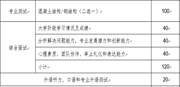 综合面试占120分,一般在英语口语之后,一共30分钟左右。基本上每个老师会提一个问题,要看老师对你的下兴趣。涉及到的内容有钢结构、混凝土结构、结构力学、材料力学、高层建筑、抗震设计、土木工程材料、土力学等学科的基础概念原理,一般老师不会为难你,题目不会很难。