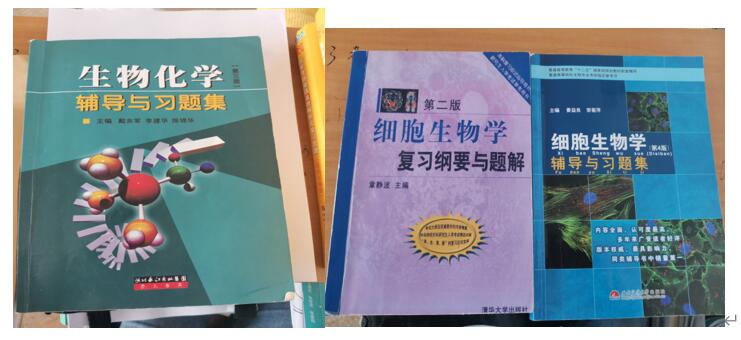 我从2021.4.1正式开始考研复习。最初三四月份开始的时候,我是先在b站听了一遍杨广笑老师的生物化学,我是直接把课顺了一遍,没有看书,有的人是习惯一边听课一边看书的,因为那个时候距离我大二学习生物化学已经学了有两年了,隔的时间有点久,我是习惯先把课都听一遍,然后心里面有个大概,看完课之后再去看的书。然后看书的同时,买的有参考书(见下图),把参考书每一章后面的小题做一遍,检验一下自己看这一章书的成果,也有助于你更认真的把书读下去,大题就先看一看,大概心里边有个印象就行,不用很标准的把答案写出来,细胞生物学也是一样,,先在b站听的四川大学的课,再过一遍书,同步做参考书上的题。看完课、书、章节测试题基本上暑假都快结束了。
