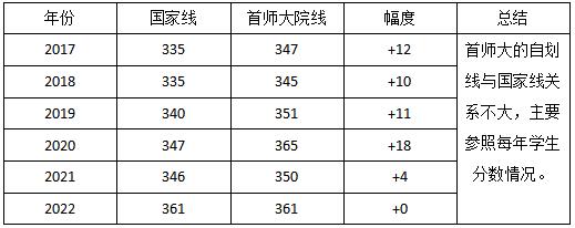 2022年,艺术学国家线从2021年的346上涨15分到361分,首师大音乐学院的院线与国家线持平。