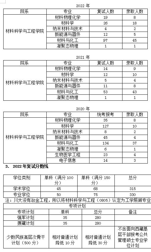由于疫情,最近几年川大材料院的复试形式为线上远程网络复试,所以不存在笔试,难度较低,具体流程可参考四川大学材料科学与工程学院官网公告-四川大学材料科学与工程学院2022年硕士研究生招生复试通知:https://mse.scu.edu.cn/xygk/xygg/23.htm。复试科目和复试参考书目(书名,版次,作者,出版社,出版年份)见下表: