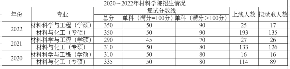 这是近三年的招生情况。22年湖南大学材料科学与工程专业的分数线相比前几年发生了巨大变化。学硕复试线暴涨60分,达到350分,数学单科线达到90分。由于前几年报名人数少,分数线低,导致2022年报名人数增多,分数线暴涨。23年报考湖南大学材料专业人数可能会继续增加,也可能会因为22年分数上涨而下降,有意向报考的同学需要做好心里准备。