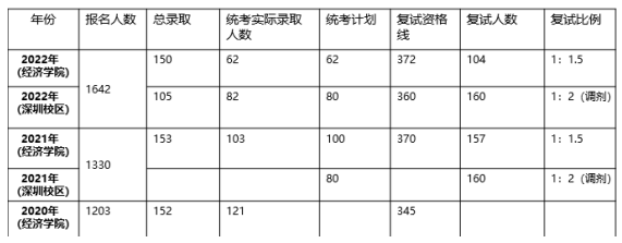 首先是择校规划,由于本科就是金融专业,在决定考研时我就确定考本专业金融,只是当初在专硕和学硕以及院校之间有所纠结。从1月开始复习数学,当时的计划是如果考经济学就考武汉的学校(湖北人),华中科技大学(难度大)、中南财经政法大学、武汉理工大学、华中师范大学;如果考专硕,金融专硕看重实习,那么就需要考去金融行业发达的北上广深,以后找实习方便。我的本科学校不是特别优秀,因此在北京上海的金融行业发展可能比较困难,因此我选择以后在广深发展,就确定了暨南大学作为目标院校。因为暨南大学金融专硕专业课涉及6、7本书,其中包括宏微观经济学,若是考经济学也会用到,没有确定考哪个学校之前,专业课也一直在复习着宏微观经济学。后来各个学校的拟录取名单出来了,暨南大学金融专硕录取人数多,虽然报录比比较严峻,但是20年分数线345,21年分数线370,(22年372)我认为是一个恰当的目标,又因为考虑到实习就业、和自己的复习情况,最终选择了暨南大学金融专硕。以下是近三年暨南大学金融专硕的录取情况: