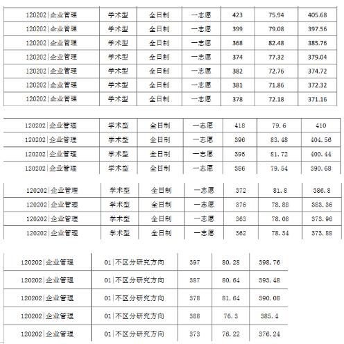 企业管理每年招生5~9人不等,在19年以及以前,每年都是招9个人,20年本来招4个人,最后复试扩招到5个人,相当于等额复试,21年本来招7个人复试扩招到8个人,22年招5个人复试方案出来后是招7个人。所以尤其是综合这三年的情况,我判断23年应该招5~7个人,更可能是7个。以下是这三年的录取人数分数情况(2022、2021、2020),因为19年以及以前是不考统计学的,所以参考价值没有这三年大。