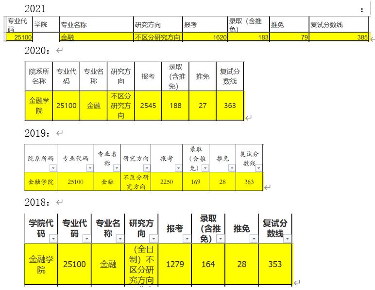 可以看到中南财金专的录取人数很多,每年都有一百多个,虽然报考的人数也很多,但是相比于那些只录十几个,二十几个的专业来说,我觉得更好把握。从往年的分数线来看,大小年的特征其实不是非常明显,18-19年是低、高,20-21年是低、高,对于22考研来说,21年的分数线385着实是挺高的,所以我认为某种程度上一定会吓走一批人,22年的分数线也许会降。这也是一种博弈的过程,你认为22年线会因为21年太高而降,当别人也这么认为时,最终线反而不降,好在22年分数线其实是降了的,是369,而且在最后公布复试名单时比招生简章上还扩招了15名。