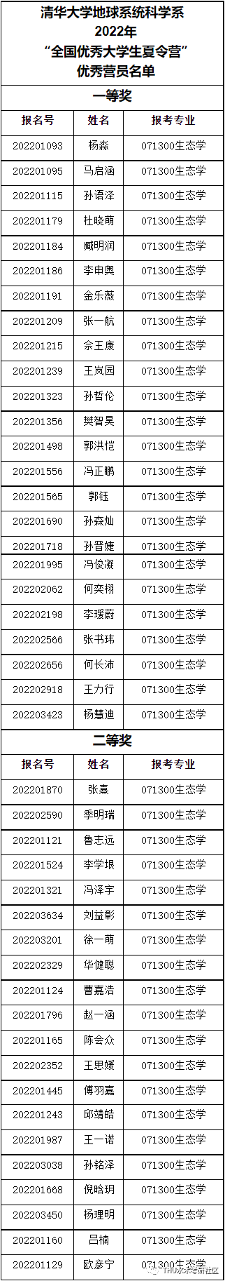 清华大学地球系统科学系2022年“全国优秀大学生夏令营”优秀营员名单