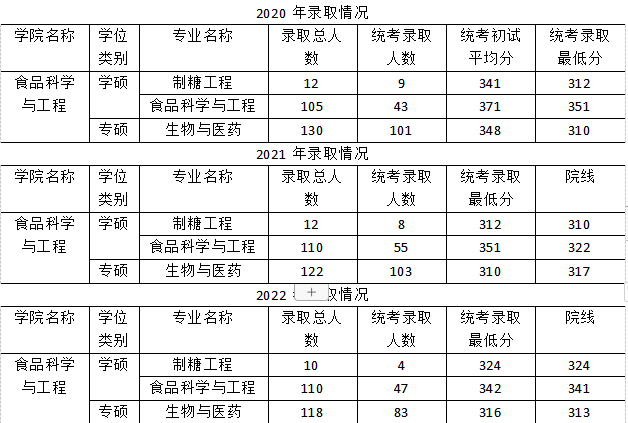 华工的食品学院一共设有三个专业,分别为制糖工程、食品科学与工程(学硕)以及生物与医药(专硕)。2022年起,专业课考试发生了调整,由原来的专业课二选一,变成了制糖工程和食科考有机,生物与医药考生化,统考英语都是英译一,所以大家在选择的时候,要时刻注意这些信息的变动。接下来讲一讲2020-2022年的录取情况。