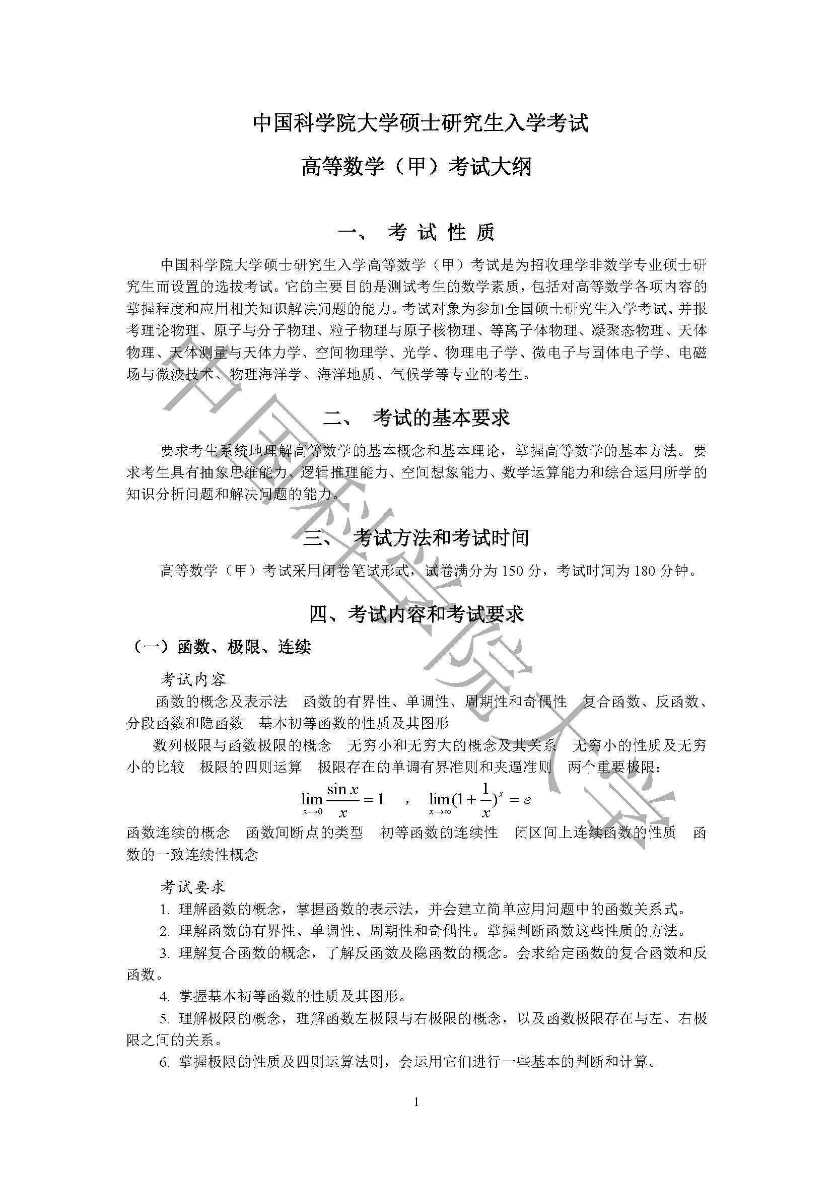 2023年中国科学院大学考研:601高等数学(甲)考试大纲