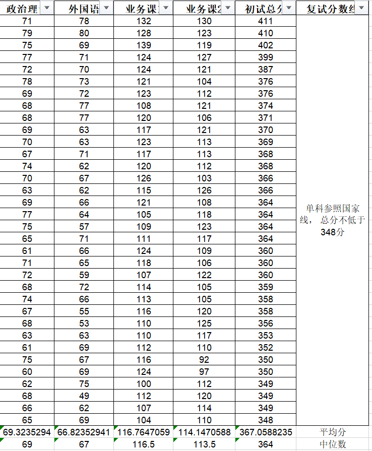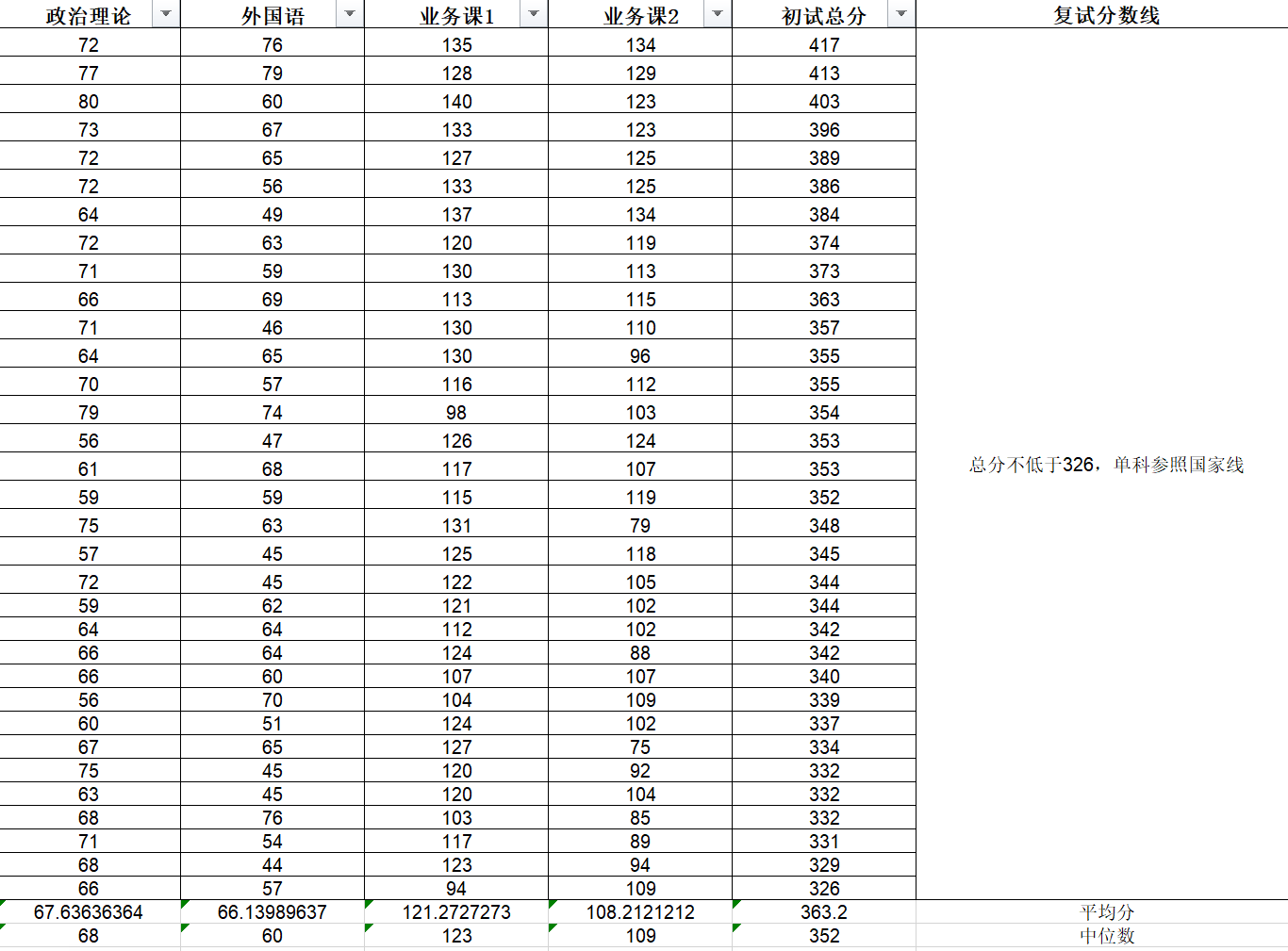 下表是2021年中央民族大学的复试分数线,我们可以通过计算平均分和中位数的方式,确定自己需要考的一个怎样的分数上岸的几率比较大。21年的国家线为321分,中央民大的录取线为326,相差不大,但从其平均分和中位数来看,如果希望自己可以更稳定地考上中央民大,最好以360为目标分数。通过360的总分,我们可以结合自己的情况,分配自己的单科成绩,尽量发挥自己的特长弥补自己的不足。这样做的一个好处是自己在备考期间有更明确的目标,之后刷题时也更有把握,知道自己离目标还差多少。