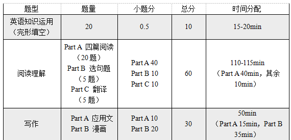 英语一的满分为100分,共分为三种题型,分别为英语知识运用、阅读理解和写作,具体的题型分值和做题的时间分配如下图,在刷题时可以作为参考。