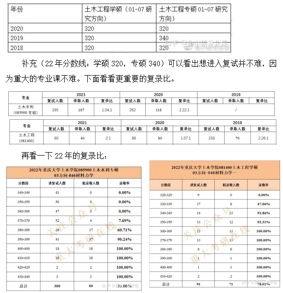 双非上岸985的难度还是比较大的,所以说择校也特别重要,不少学校就会有学历歧视,但是重庆大学是一个特别公平的学校,初试不压分,复试也极其公平,不会在乎你的本科出生。只要你初试分数够高,复试发挥稳定,你就是下一个重大研究生。下面对土木专业今年考情做个简单分析,先看历年分数线
