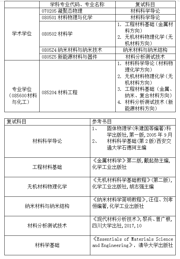 注:学硕-生物医学工程,专硕-电子信息、生物医学工程,已不在材料院。上述复试参考书目,个人感觉还是针对线下复试存在笔试的情况,线上复试建议以材料科学基础为主,可适当结合所报考方向和上表书目适当补充。
