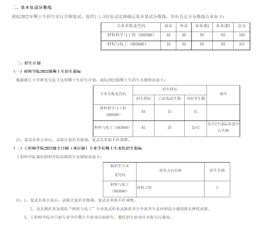 报录比,录取人数,复试线,复试比及报考难度:报录比正常来说基本上学硕,专硕都是7:1左右(21年由于专硕报考人数过少,报录比接近2:1,复试线仅为320)。录取人数一般都是各30人左右,复试被刷的前几名有较小概率会校内调剂。(比如21年学硕被刷的可以调剂到专硕,22年只有专硕被刷的前两名可以调剂到工程师学院)。近五年学硕复试线(2018-2022):339,379,382,367,380。专硕复试线(2018-2022):355,375,375,320,365。复试比不高,一般都维持在1:1.3。浙江大学是国内名校,报考难度肯定是有的,竞争也比较激烈。而且从21年开始材料学院专业课出题老师更换了,出题风格变化较大,因此可以参考的有价值的真题比较少,需要自己对课本的知识有更加深入的理解,要学会融会贯通。这也使得报考难度有一定的提升,不过风险与收益是成正比的,因此要根据自己的实际情况慎重择校,争取一战成硕。