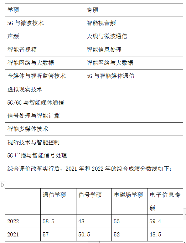 2021年起,中国传媒大学进行了研究生招生改革。对考生影响最大的变化是引入材料评议环节,会在公布国家线前要求考生提交本科成绩单、获奖经历、外语水平证明、科研设想等材料,由老师给出材料成绩,按初试成绩占比70%、材料成绩占比30%的方式得出综合成绩,即综合成绩=(初试成绩/5)*70%+材料成绩*30%根据综合成绩确定复试名单。这要求同学们注重本科阶段的积累,多多参加比赛和科研。本科经历不多的同学也不必太过担心,报考中传电子信息专业的多为双非一本和二本学生,总体而言并不会有太多人拥有丰富的竞赛和科研经历,且绝大多数院校复试时也会要求提交以上资料。采用综合成绩划线后,中传对总分和单科线的划定都是和国家线相同(2022年为总分273分,英语政治38分,数学专业课57分),对偏科同学更加友好。