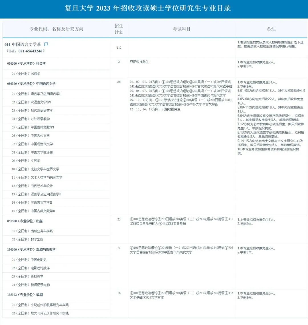 2023年复旦大学中国语言文学系硕士研究生专业目录