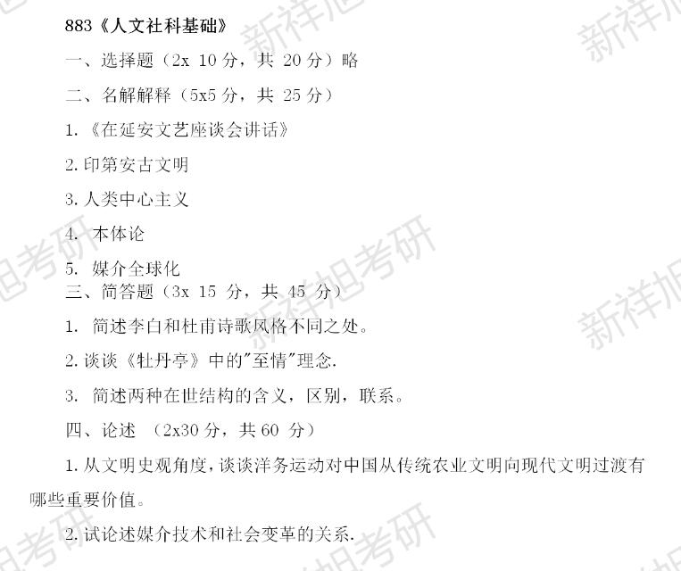 一、考试目的 本科目考查考生的人文社科基础知识和基本素养。 二、考试内容 第一部分:文学 考查考生对中国文学发展历程、文艺思潮、代表人物、风格流派、 经典作品等方面基本知识的理解与掌握。 第二部分:文明史 考查考生对人类从农业文明到工业文明发展历程的基本脉络,以 及不同阶段代表性文明的主要特征、重大成就和不同文明之间交流基 本状况的理解和掌握。 第三部分:哲学 考查考生对哲学本体论、认识论、伦理观、审美观、历史观的基 本概念、核心命题、主要人物和流派等方面的理解与掌握。 第四部分:媒介与社会 考查考生对媒介社会学分析视野,以及媒介与政治、经济、社会 等多维关系互动的基本知识和理论的理解与掌握。 三、试题类型 选择题、名词解释题、简答题、论述题等。
