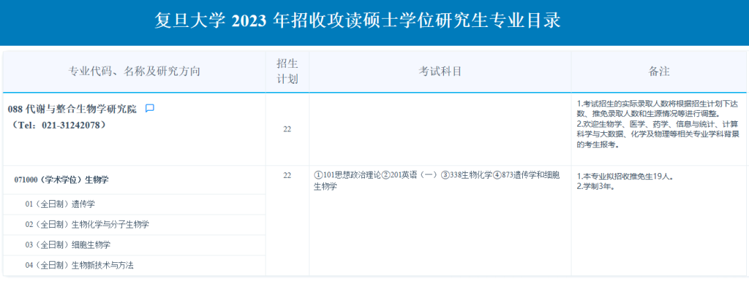 复旦大学考研辅导班:2023年复旦大学代谢与整合生物学研究院硕士考研专业目录