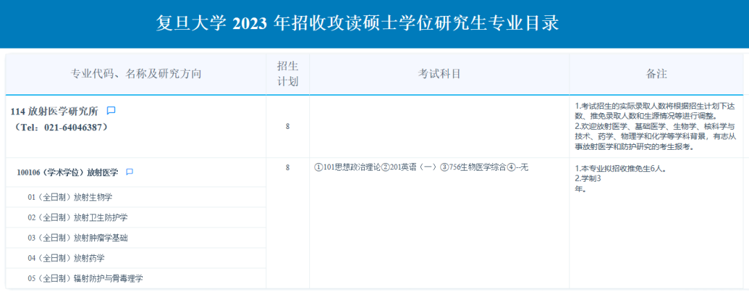 复旦大学考研辅导班:2023年复旦大学放射医学研究所硕士研究生专业目录