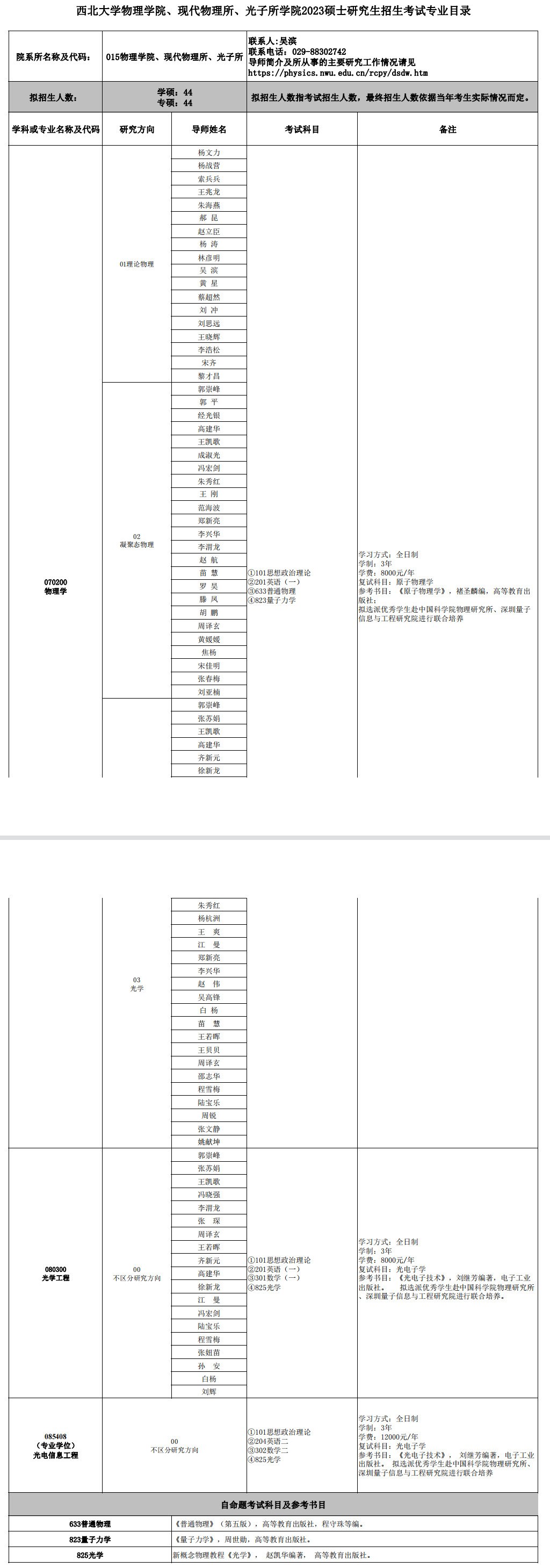 西北大学考研辅导班:23年西北大学物理学院硕士招生专业目录及参考书目