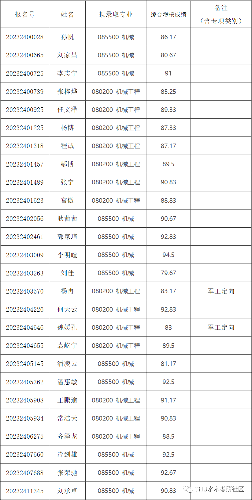 经综合考核和研究生招生工作领导小组讨论,报学校研究生招生工作领导小组批准,清华大学机械工程系2023年接收推荐免试直硕生拟录取名单,现已确定,现予以公示