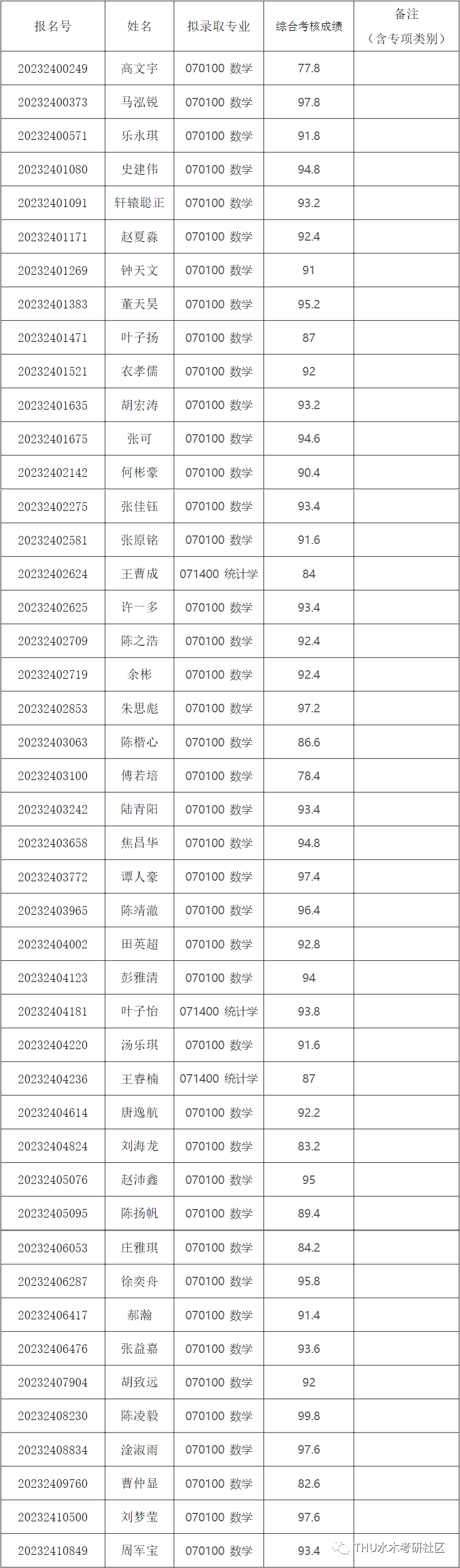 经综合考核和研究生招生工作领导小组讨论,报学校研究生招生工作领导小组批准,清华大学数学科学系2023年公开招考博士研究生拟录取名单,现已确定,现予以公示。