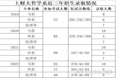 可以看到随着报考人数的增长,2019年到2022上海财经大学哲学系三个专业的复试分数线均逐年攀升,2022年的复试线已经达到了三百七八,并且预计上财大哲学系将被越来越多的同学熟悉。但各位决定报考的同学不用对2022年如此之高的复试线担心,根据笔者对考试大纲以及真题的研究,哲学系的考试总体不刁钻,以哲学基础知识和基本素养为主;差额复试的比例是1:1.2,复试不接收校外调剂,对第一志愿考生很友好;并且2022年外哲和伦理学专业都进行了扩招,增加了一到两个录取名额,大家不要过分担心呀。