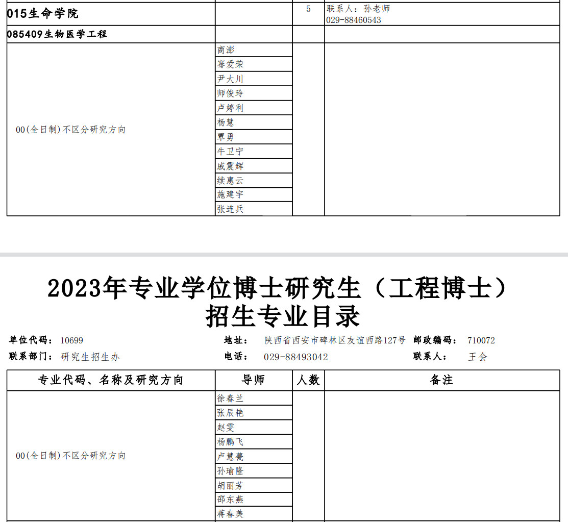 西北工业大学2023年生命学院专业学位博士研究生招生专业目录