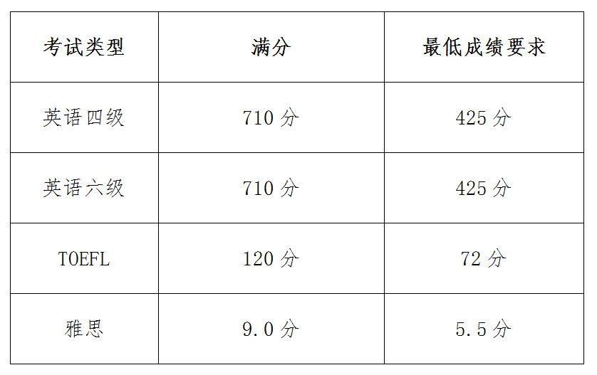包括:TOEFL、IELTS、CET-4、CET-6。本科至硕士连续在读应届生或毕业三年内的非应届硕士研究生的CET-4、CET-6成绩证明不受时间限制。掌握非英语语种的申请人,需提供相应等级的能够证明自己外语能力的材料;