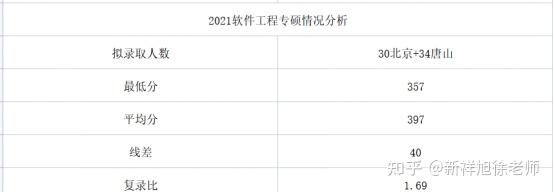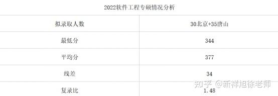 上图软件工程拟录取名单数据分析,复录比为1.48,相对于21年的复录比有所降低。2022年进入复试的最高分416,最低分343,平均分371,相对于21年有所降低,并且2022年的拟录取人数相对于21年,增加了1个唐山名额,从分数下差额可以看出,基本上要超复试线40分,是比较稳的,其他同学在复试的过程中要继续努力。