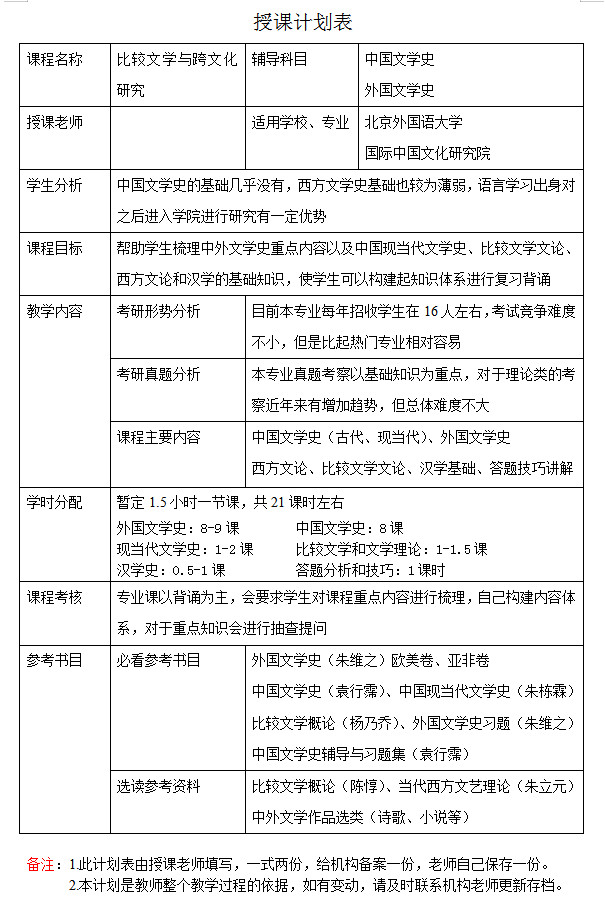 北京外国语大学考研辅导班:2024北京外国语大学国际中国文化研究院比较文学与跨文化研究考研辅导授课计划表