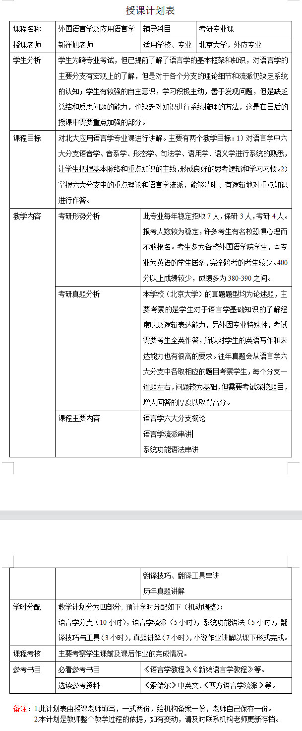 新祥旭考研:2024年北京大学外国语言学及应用语言学专业考研一对一辅导授课计划