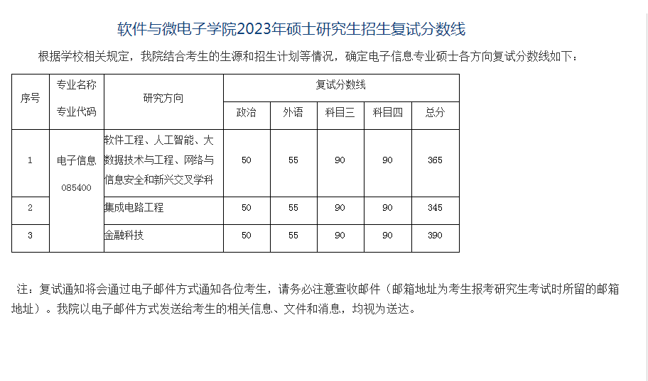 北京大学软件与微电子学院2023年硕士研究生招生考试复试分数线