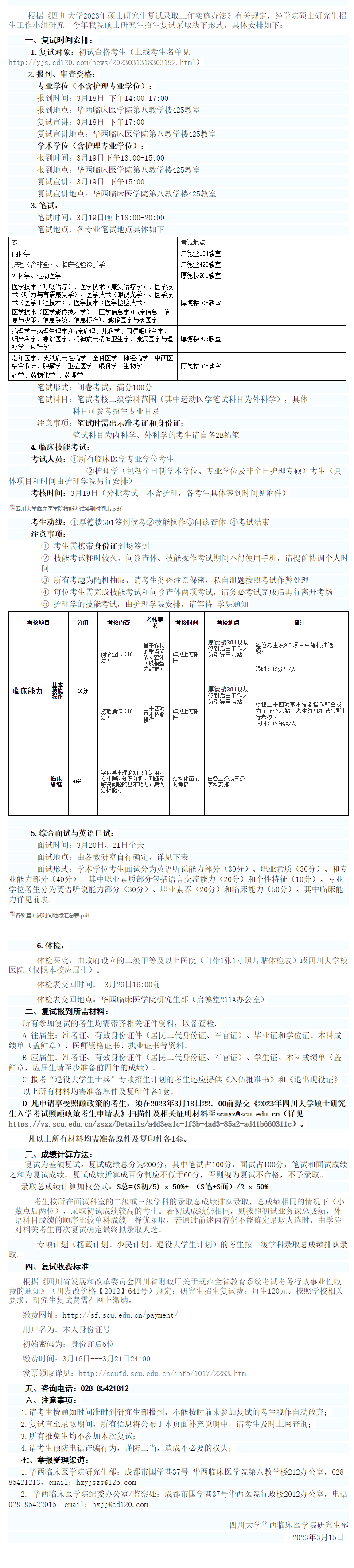 新祥旭考研:四川大学华西临床医学院2023年硕士研究生招生复试通知