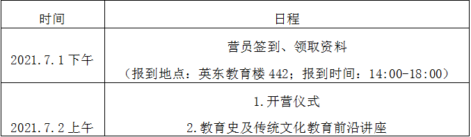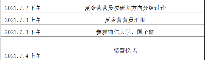 北京师范大学教育学院的夏令营一般在5月份中下旬发布活动举办通知,在7月份上旬举行,为期四天。2021年是该专业第一次召开夏令营活动,并且是与教育学部教育历史与文化研究院一同举办的,所以参营的学生有很多是走学硕道路的。该夏令营的具体规模和开营目的是:教育史30人,传统文化教育10人。将开展“学术前沿讲座、营员与教授一对一交流、导师制学习、社会考察”等活动,让营员了解北京师范大学教育学部及其教育历史与文化研究院,加强营员对中国教育史、外国教育史、传统文化教育等专业的认知。其对申请者有资格要求:本科前3年(前5学期)总成绩排名在该校同年级本专业前20%之内(但成绩不在前20%但在科研方面有优异表现者,也可以申请。)该夏令营没有英语水平相关的硬性要求。夏令营活动较为丰富,包含讲座、分组讨论及展示、师兄师姐交流会、面试、参观辅仁大学和国子监等。下面通过其往年夏令营活动安排来进行介绍。