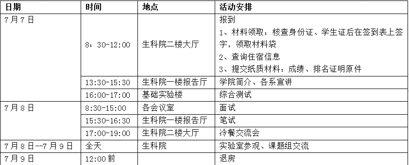笔试和面试不用说,后面第二部分会详细讲。除了笔试、面试之外,我认为最重要的就是实验室的参观。表2的安排表,学院没有在网上公开。现在随着校园的开放,后期的夏令营大概率都是线下参与了,这张表大家可以多看看。在这里,我也和大家重点介绍一下南大生科线下实验室参观的注意点。在参观时,大家需要穿着夏令营提供的短袖,这样不同实验室的老师看到夏令营衣服,就明白你是来参观实验室的,防止乌龙事件,例如认为你是推销的。在这个参观的过程中,最好提前准备好你的简历,这样可以让老师对你的情况一目了然,后期你的简历也可以留在老师这边,这样老师以后拿起简历,起码能记得你的名字。来参观的营员很多,如果没有简历,老师后期可能就真的记不得你了。在参观过程中,多和老师交流,争取能让老师记住你。简历的内容可以是你本科参加的科研项目,必修课的成绩,目前已经掌握的实验技能,如果你发过论文,那就最好了。