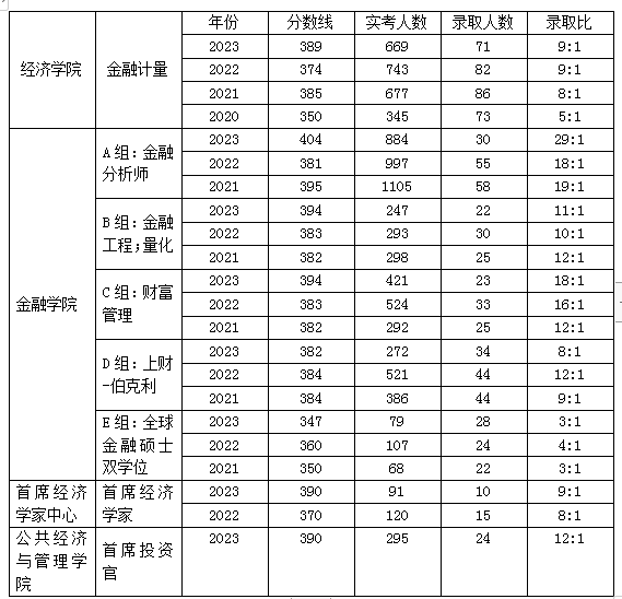 从以上可以看出,金融学院A组每年报录比都非常高,相对来说经济学院的金融计量方向难度较低。今年经济学院新增数字经济专业,金融学院新增滴水湖方向,给复试被刷的同学一个调剂的新选择。
