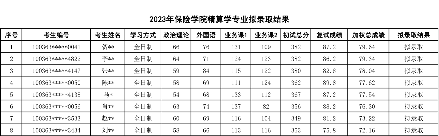 七、精算学专业2023年考研拟录取结果