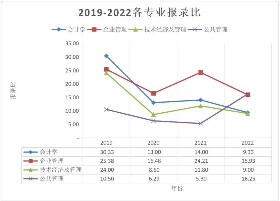 从 22 年的官网数据中可以看出,会计学录取名额较少,报名人数较少,报 录比在 9:1 左右;企业管理录取名额最多,报考人数最多,在往年考研成绩中 高分选手多出现在企业管理专业,专业报录比在 16:1 左右;技术经济及管理的 报录比同会计学差不多为左右 9:1 ,报考人数与招生名额较会计学多一倍左右; 公共管理的报录比同企业管理差不多在 16:1 左右。