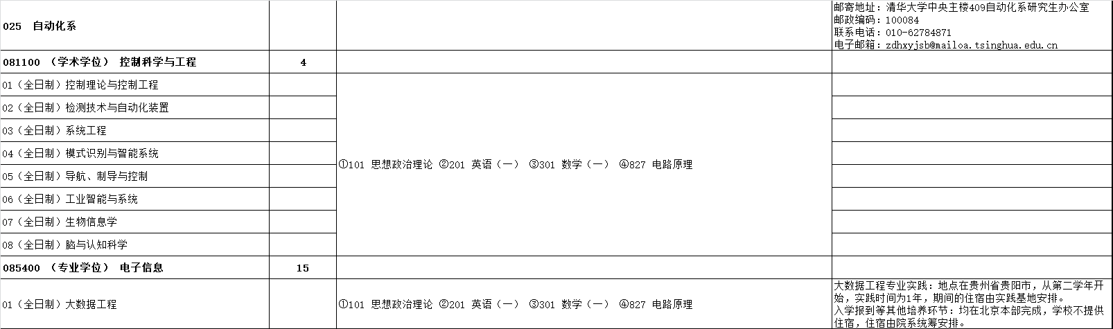 清华大学自动化系2024年硕士研究生统考招生专业目录、考试科目、招生人数