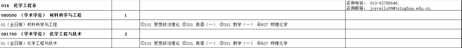 清华大学化学工程系2024年硕士研究生统考招生专业目录、考试科目、招生人数