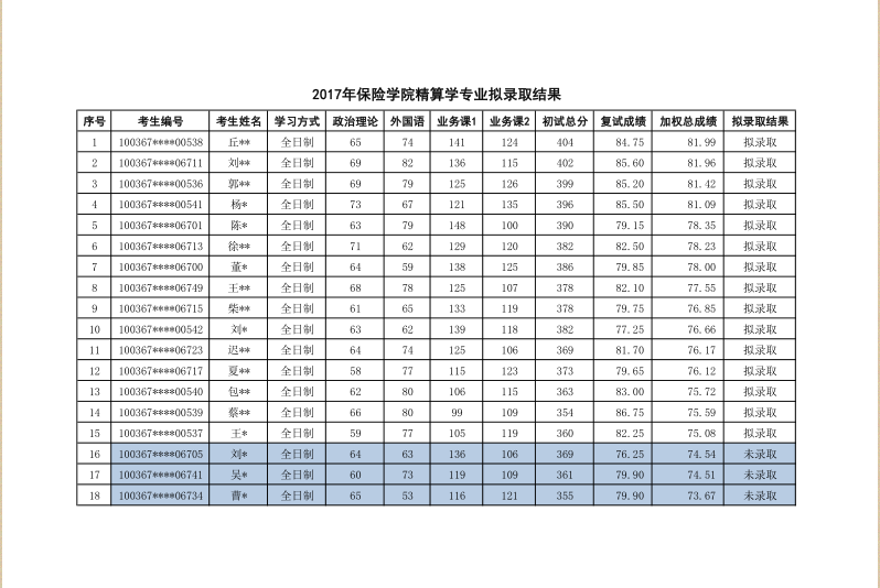 2017年对外经济贸易大学保险学院精算学研究生拟录取名单