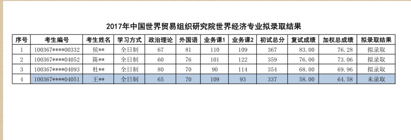 2017年对外经济贸易大学中国世界贸易组织研究院世界经济研究生拟录取名单